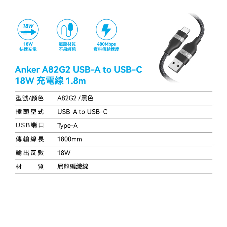A82G2 USB-A to Type-C 18W 超軟充電線-1.8m-黑