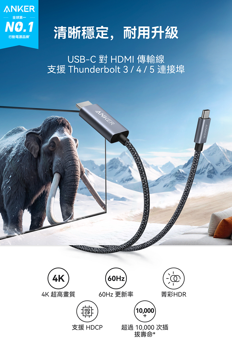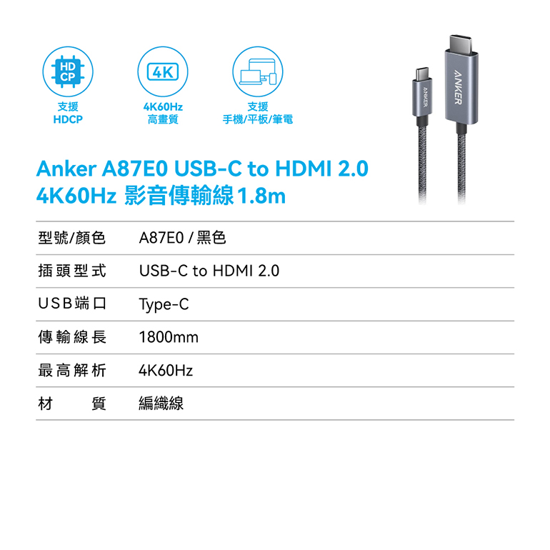 A87E0 Type-C to HDMI 2.0 4K60Hz編織傳輸線-1.8m-黑